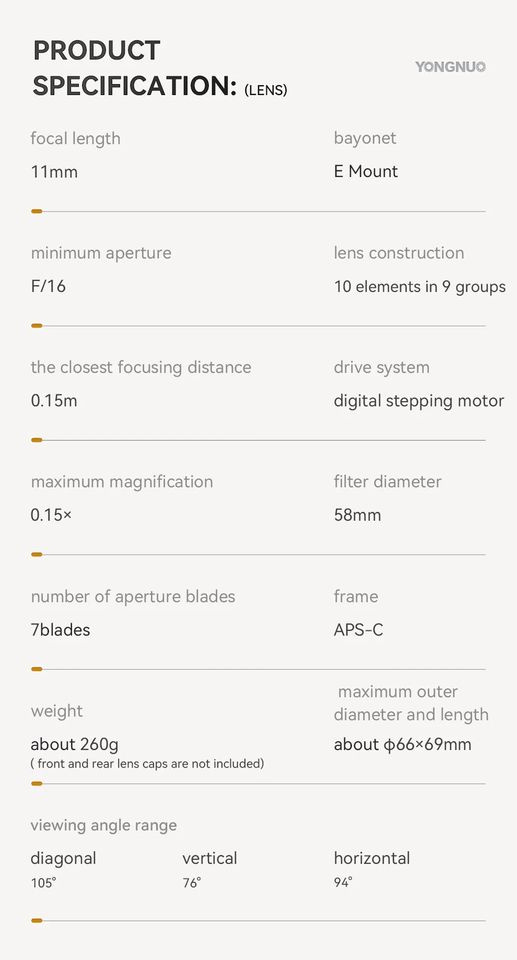 ชื่อสินค้า:เลนส์มุมกว้างพิเศษ Yongnuo AF APS-C Frame YN11mm F1.8S DA DSM
