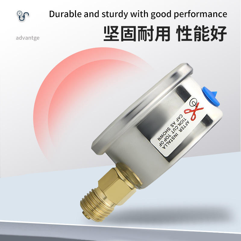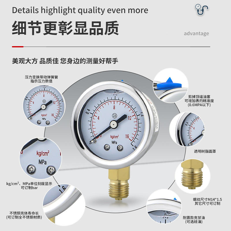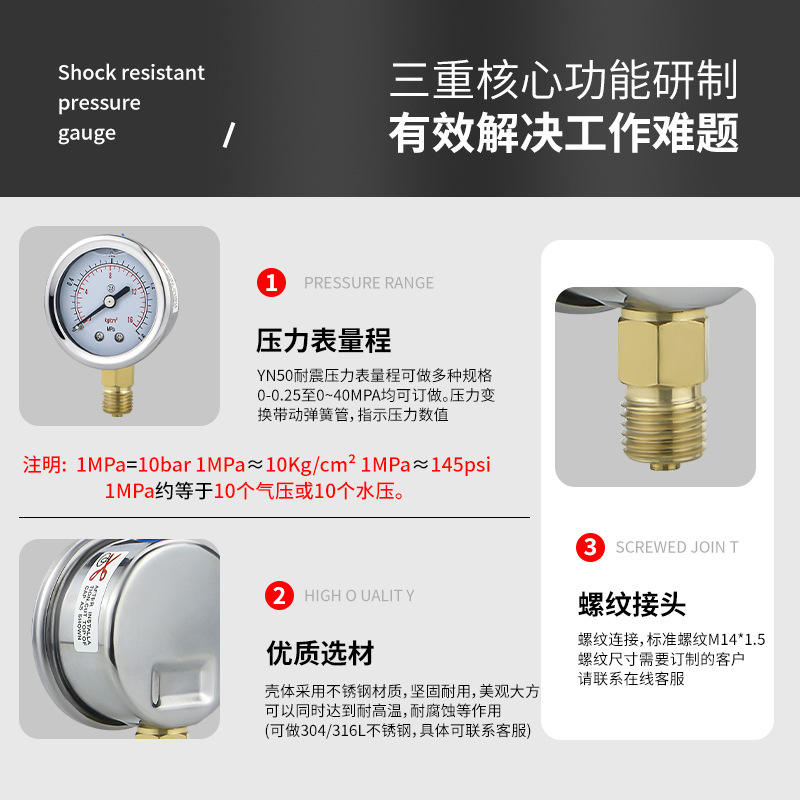 YN50 shock-resistant pressure gauge for water, oil, and air pressure; radial shockproof and corrosion-resistant stainless steel