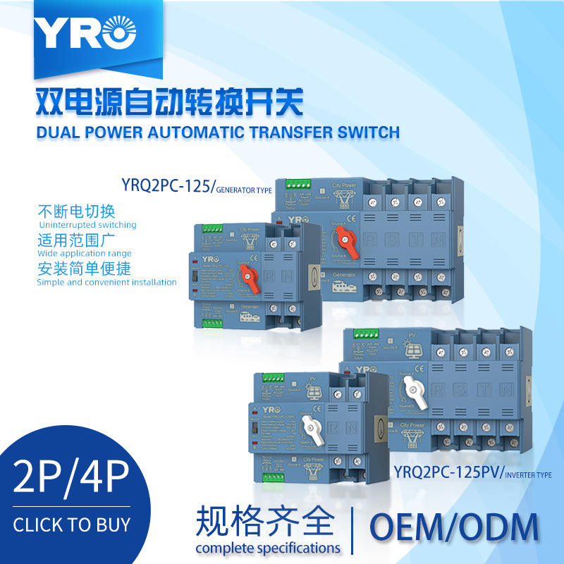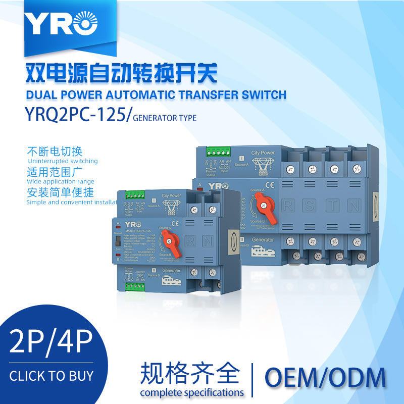 สวิตช์โอนถ่ายอัตโนมัติแบบสองระบบไฟฟ้า YRO 2P 125A เกรด PC สำหรับไฟฟ้าสาธารณะและเครื่องกำเนิดไฟฟ้าแบบเฟสเดียว