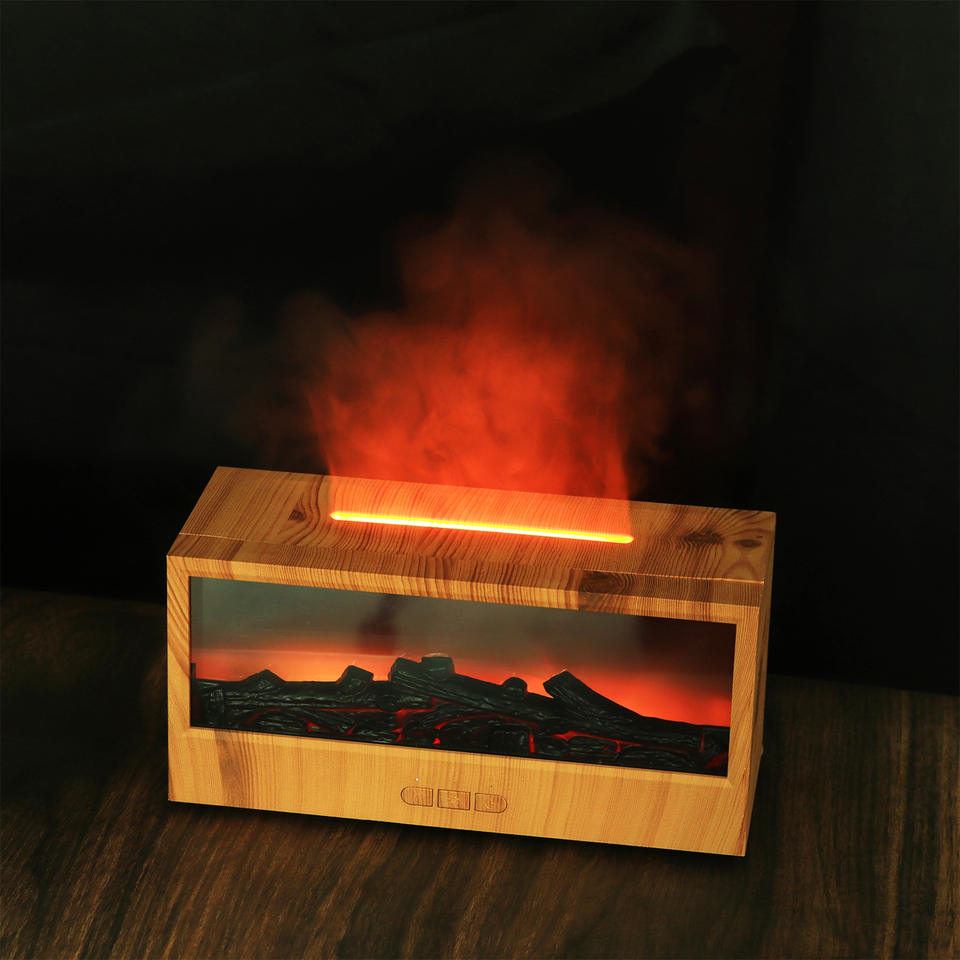 เครื่องเพิ่มความชื้นในอากาศรุ่น YX-717 ลายไม้สีอ่อน พร้อมฟังก์ชั่นกระจายกลิ่นหอมแบบตั้งโต๊ะ ใช้พอร์ต USB 5V ควบคุมด้วยรีโมท พร้อมไฟสร้างบรรยากาศเปลวไฟ