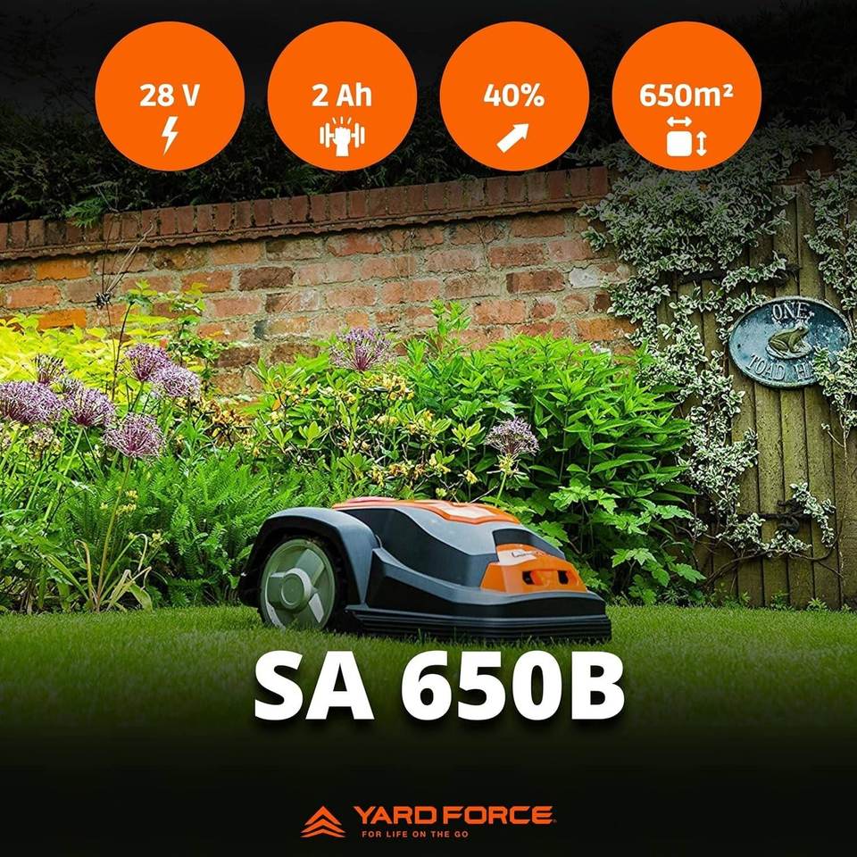 เครื่องตัดหญ้าอัตโนมัติไร้สาย Yard Force SA650B แบบ 4 จังหวะ พร้อมความสูงในการตัดสูงสุด 1000 มม. และถังเก็บหญ้าสำหรับตัดหญ้า