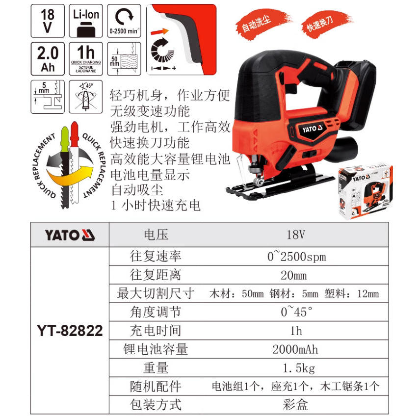 เลื่อยจิ๊กซอว์ไร้สาย ยาโต้ 18V แบตเตอรี่ 2000mAh ความลึกการตัด 50 มม. สำหรับไม้ โลหะ พลาสติก