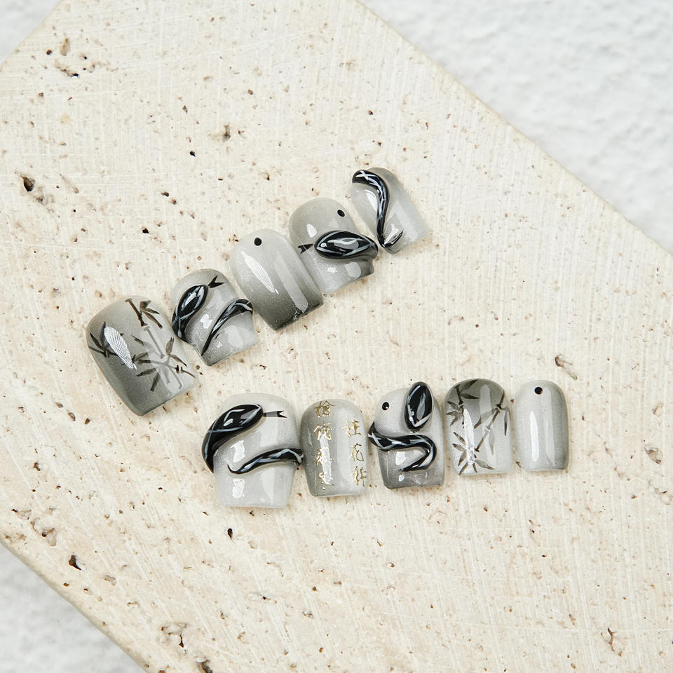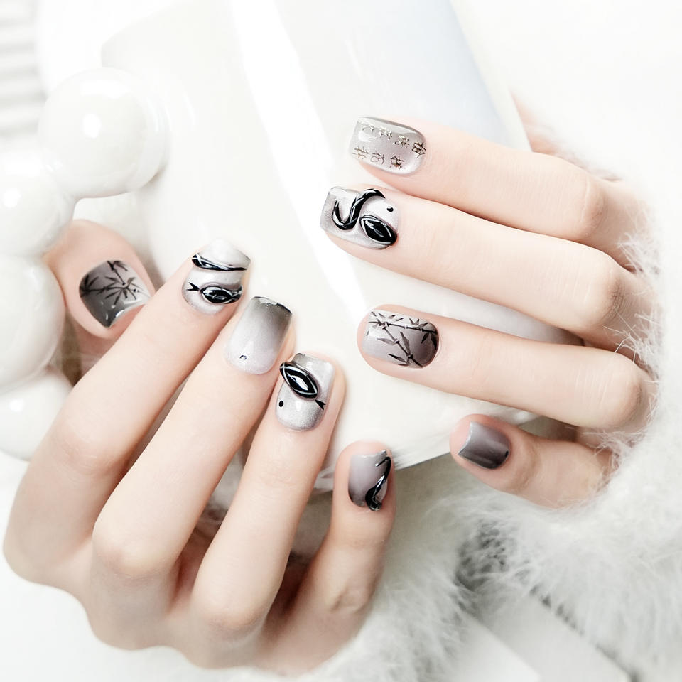 แผ่นติดเล็บลายหนังงูแบบใหม่ติดด้วยหมึกแท้สวมใส่ได้สไตล์จีนเล็บปลอมคุณภาพสูงถอดออกได้ปลายเล็บฝรั่งเศส