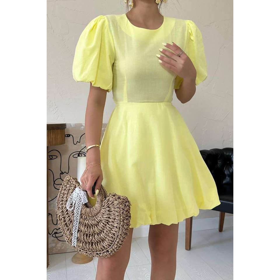 เดรสผ้าลินินสีเหลืองผูกหลัง ทรงเอ คอโอ เอวธรรมชาติ ระบายอากาศได้ดี สวมใส่สบายๆ ทุกวัน