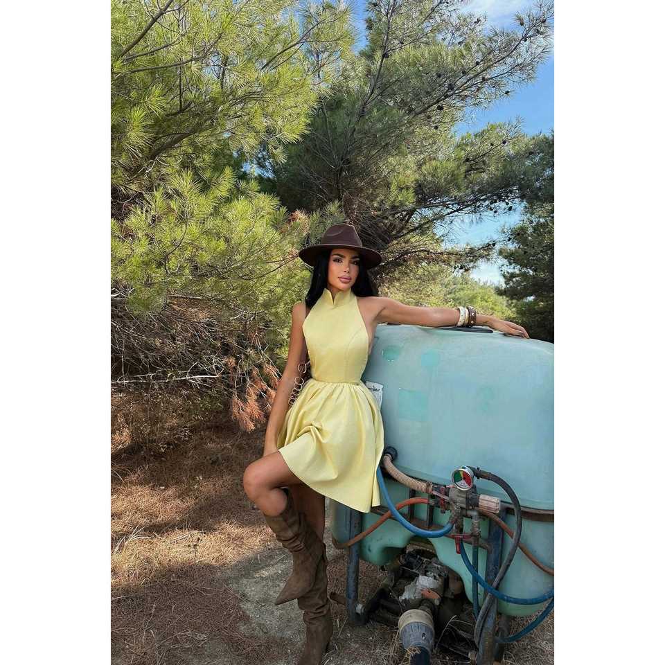 เดรสสีเหลือง Belluno รุ่นมินิ แบบเปิดหลัง คอเหลี่ยม ผ่าข้าง สายคล้องคอแบบสปาเก็ตตี้ ทรงเอ็มไพร์ เรียบร้อย เหมาะสำหรับใส่ไปเที่ยวกลางวัน หรือไปคลับ ไซส์ XS สำหรับฤดูใบไม้ผลิ