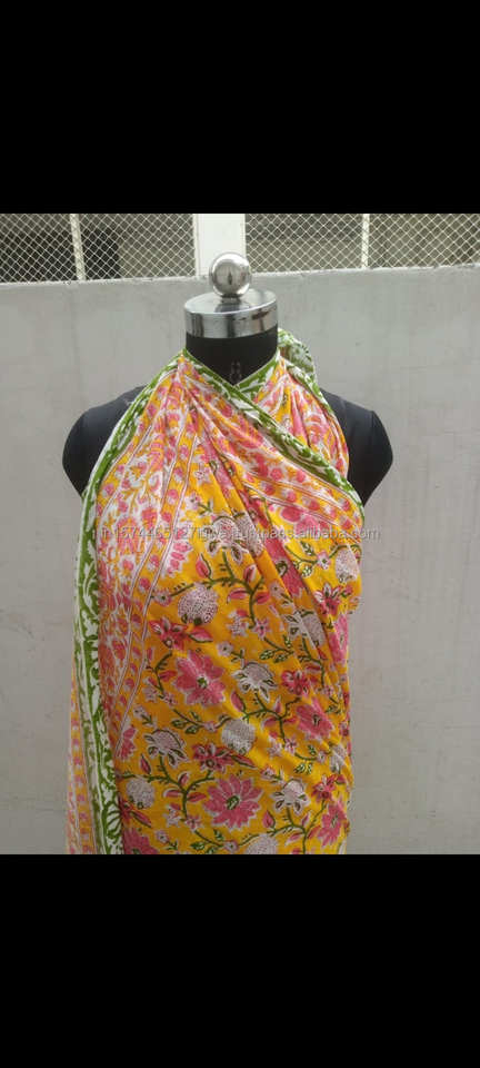 ผ้าโสร่งผ้าฝ้ายพิมพ์ลายดอกไม้สีเหลืองงานแฮนด์เมดชุดคลุมผ้าพันคอชายหาดฤดูร้อน