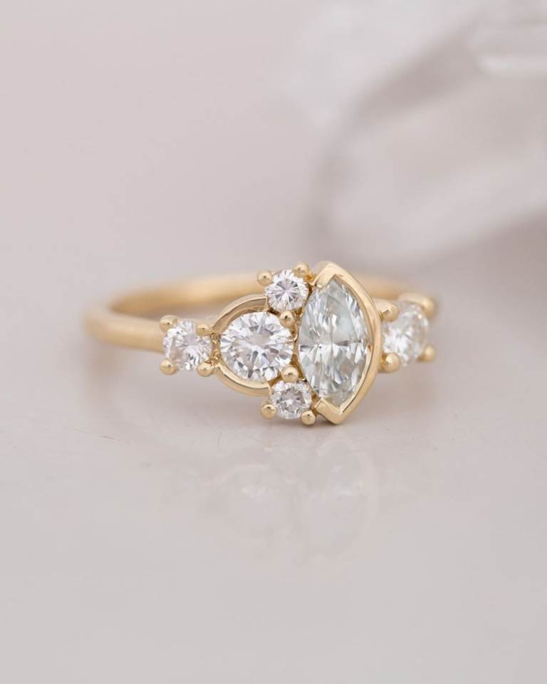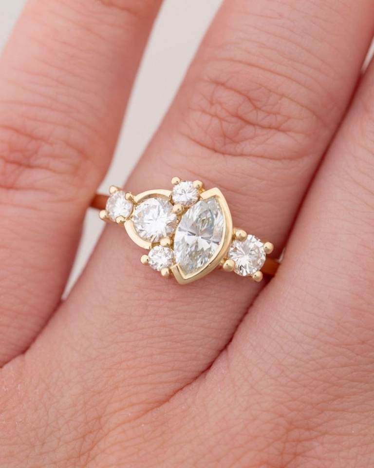 แหวนหมั้นเพชรทองคำขาวสีเหลืองทอง 1.30 กะรัต ทรงมาร์คีส์ ประดับเพชรแบบคลัสเตอร์ แหวนแต่งงานแบบฝังขอบ CVD ระดับ VS1 เครื่องประดับชั้นดี