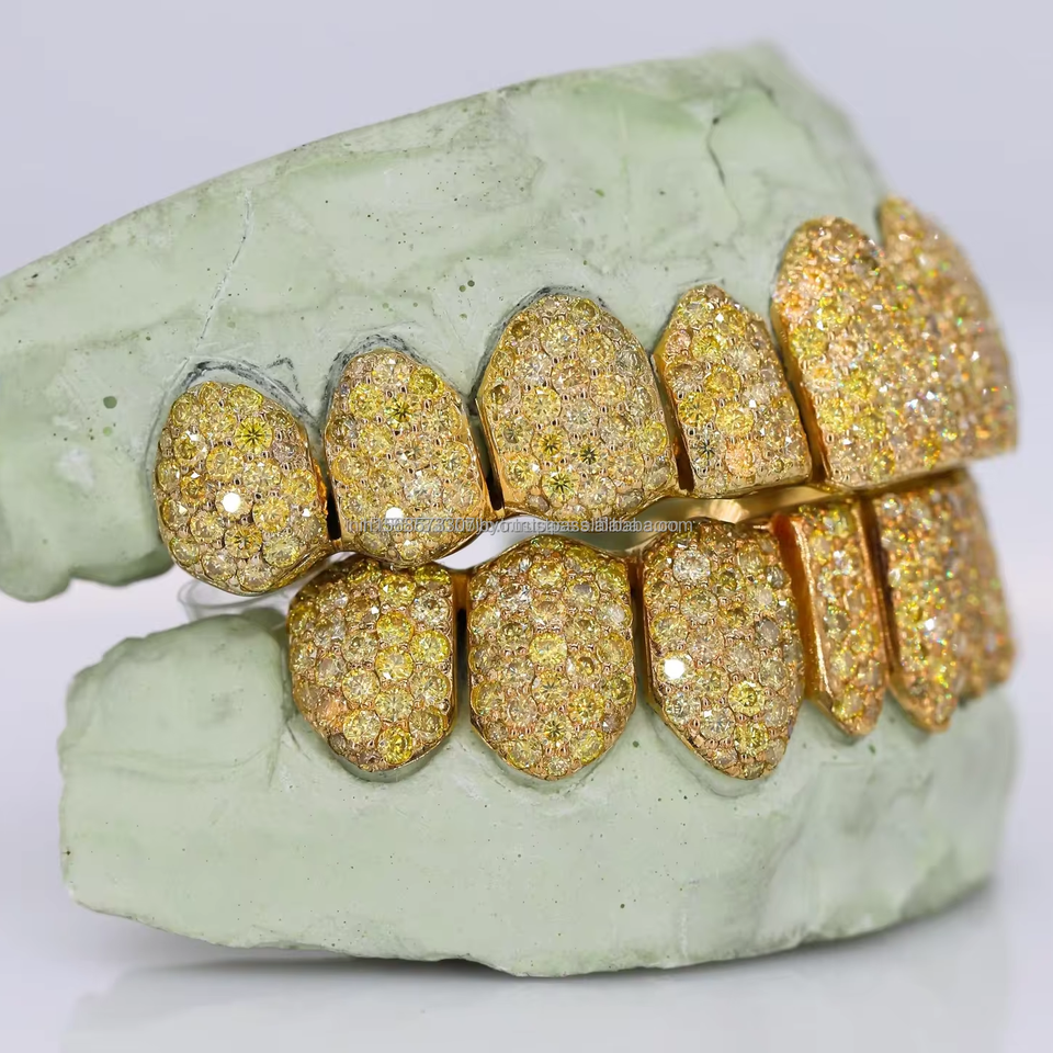 ตะแกรงเพชรฮิปฮอปชุบทองสีเหลืองเครื่องประดับตามสั่งตามแบบฮิปฮอปยอดนิยมมีฟัน8ซี่ด้านบนและ8ซี่ด้านล่าง