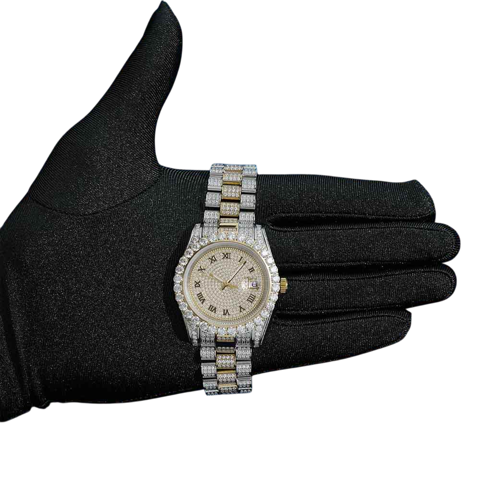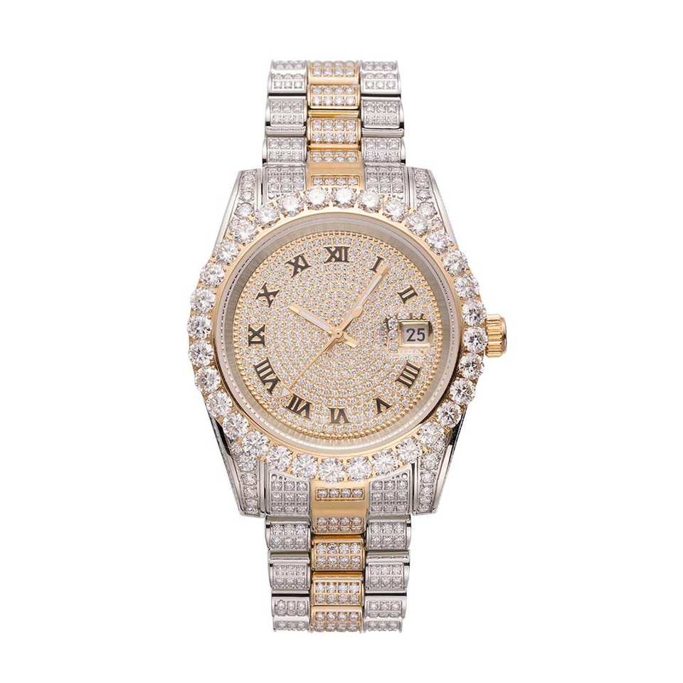 หน้าปัดสีเหลืองทองมันวาวพร้อมสายสีเงินและสีทอง VVS นาฬิกาเพชร Moissanite สำหรับผู้ชาย