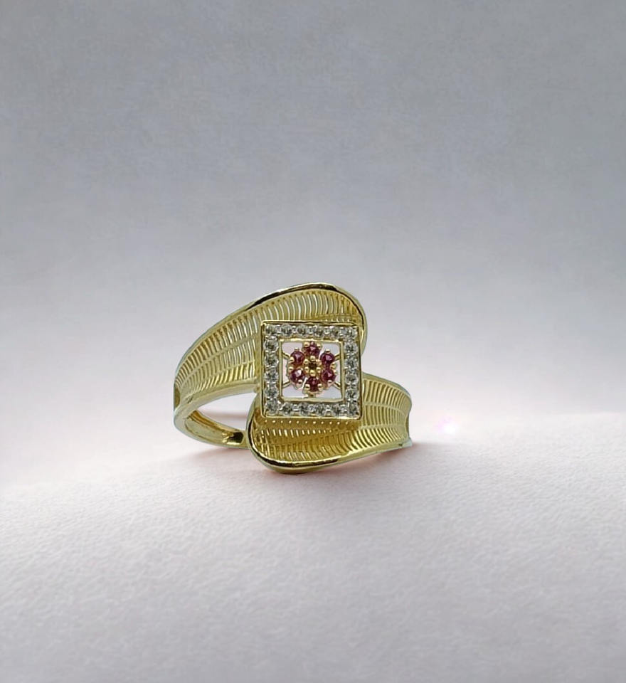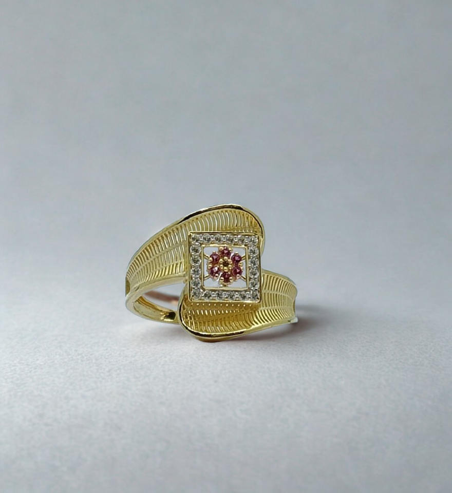 แหวนทองคำสีเหลืองลายเท็กซ์เจอร์ประดับเพชรทรงสี่เหลี่ยมและดอกไม้ประดับไพลินสีชมพู ดีไซน์หรูหราสำหรับผู้หญิง