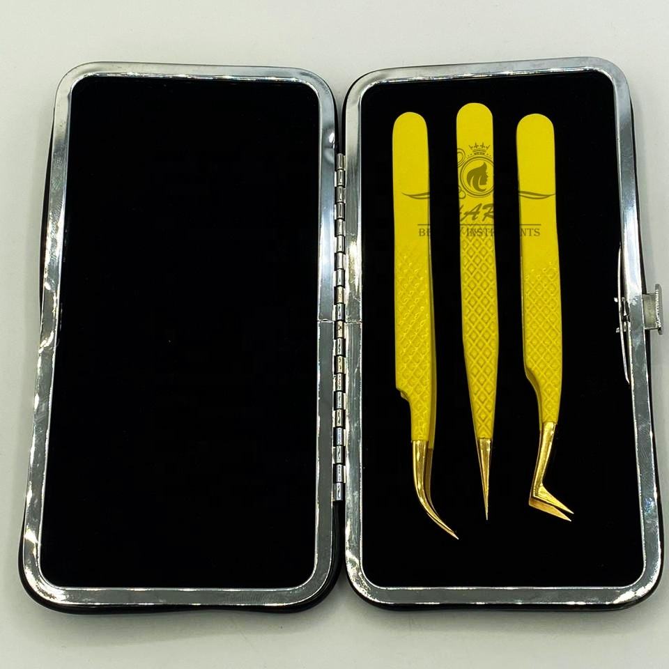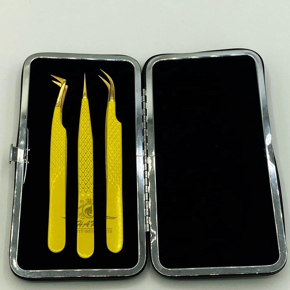 ชุดแหนบต่อขนตาสแตนเลสโทนสีเหลืองทองประกอบด้วยปากคีบเส้นใยทรงโค้ง/ตรง/รูปตัว L สำหรับร้านเสริมสวย