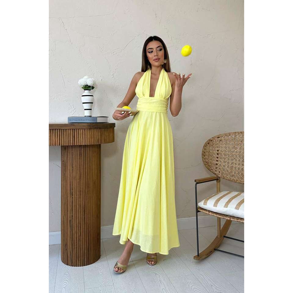 ชุดเดรสผ้าลินินสีเหลืองทรงเอไลน์แบบผูกคอ เอวสูง ระบายอากาศได้ดี เหมาะสำหรับงานปาร์ตี้และใส่ลำลอง