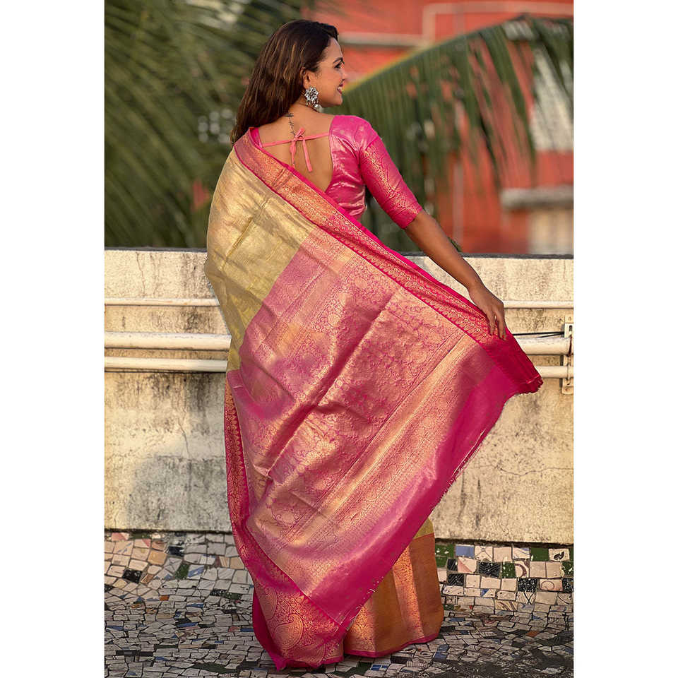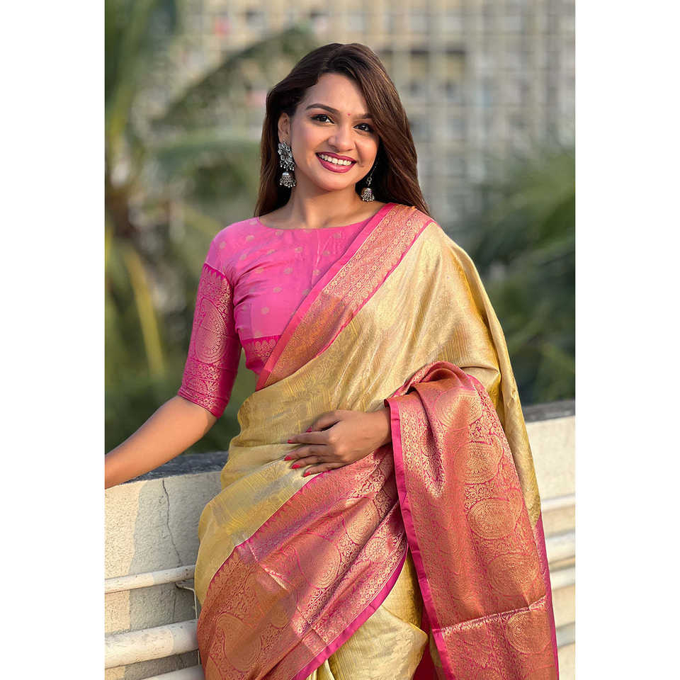ผ้าไหมคันจิวารัมสีเหลืองเนื้อนุ่ม เลเฮริยา ซารี ผ้าไหมทอมือแบบดั้งเดิม ลายปักดิ้นทอง สำหรับชุดอินเดียและปากีสถาน ผ้าทอชั้นดี น้ำหนัก 0.6 กรัม