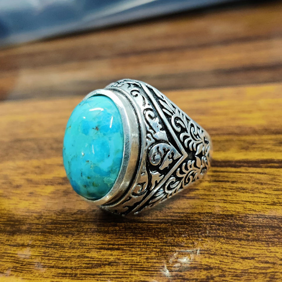 แหวนแต่งงานสีฟ้าเทอร์ควอยซ์สำหรับผู้ชายสไตล์ตุรกี ดีไซน์เฉพาะตัว ทำจากเงินแท้ 925 ชุบดำแบบออกซิไดซ์ เครื่องประดับสไตล์โบฮีเมียน