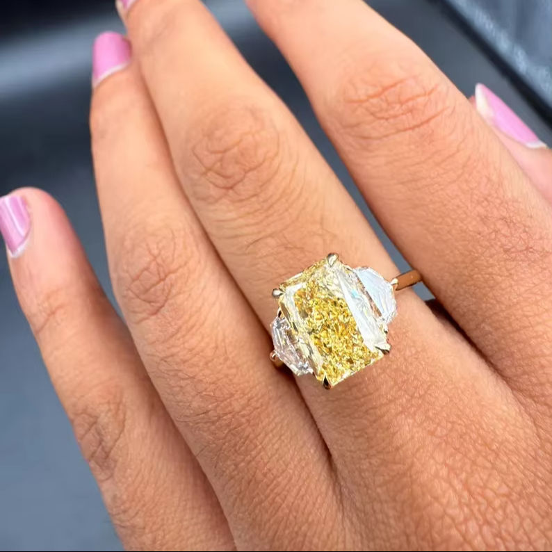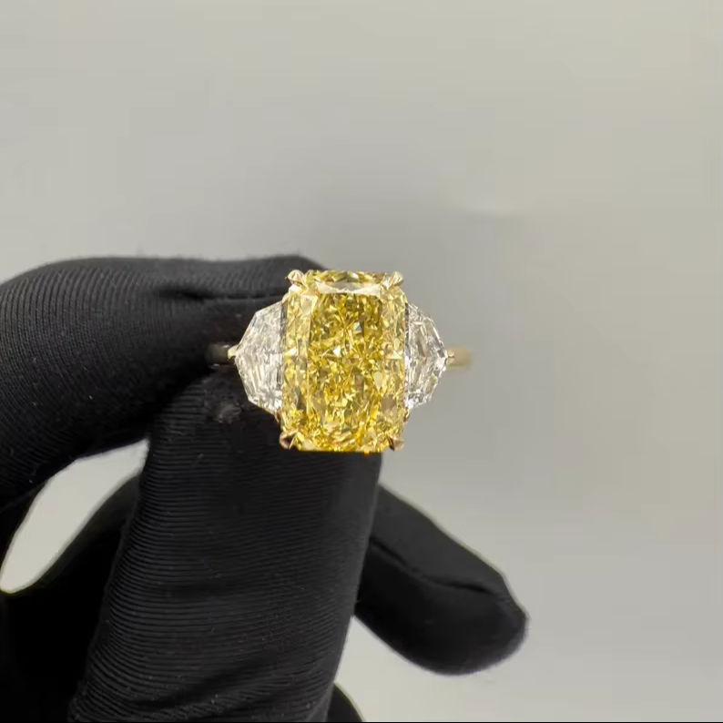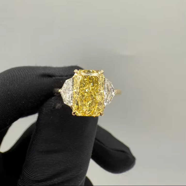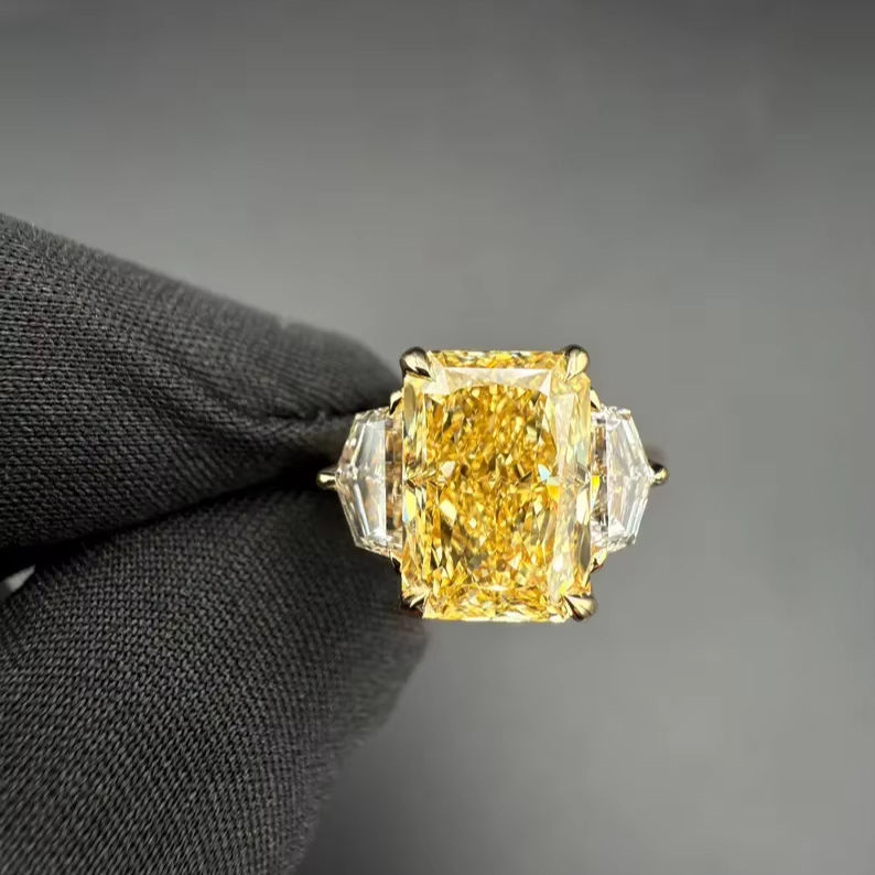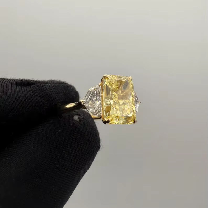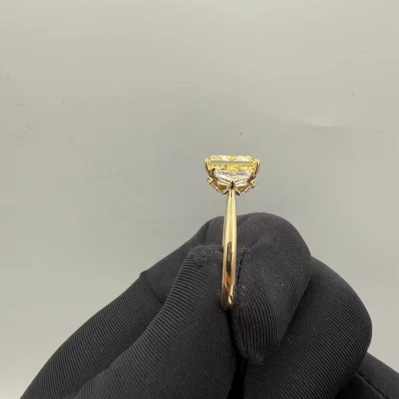 แหวนเพชรทรงสี่เหลี่ยมคางหมูสีเหลืองสดใส 4.02 กะรัต รับรองโดย IGI ชุบทอง ดีไซน์หรูหรา ของขวัญสำหรับเจ้าสาว
