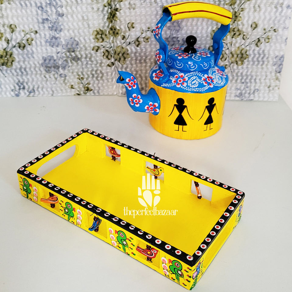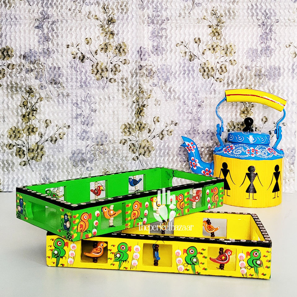 ถาดเก็บของหวายสีเหลืองเพ้นท์ลายด้วยมือ ภาชนะใส่อาหารแบบพกพาสำหรับใช้ในครัว