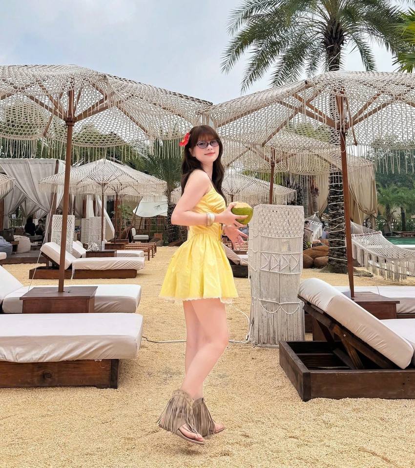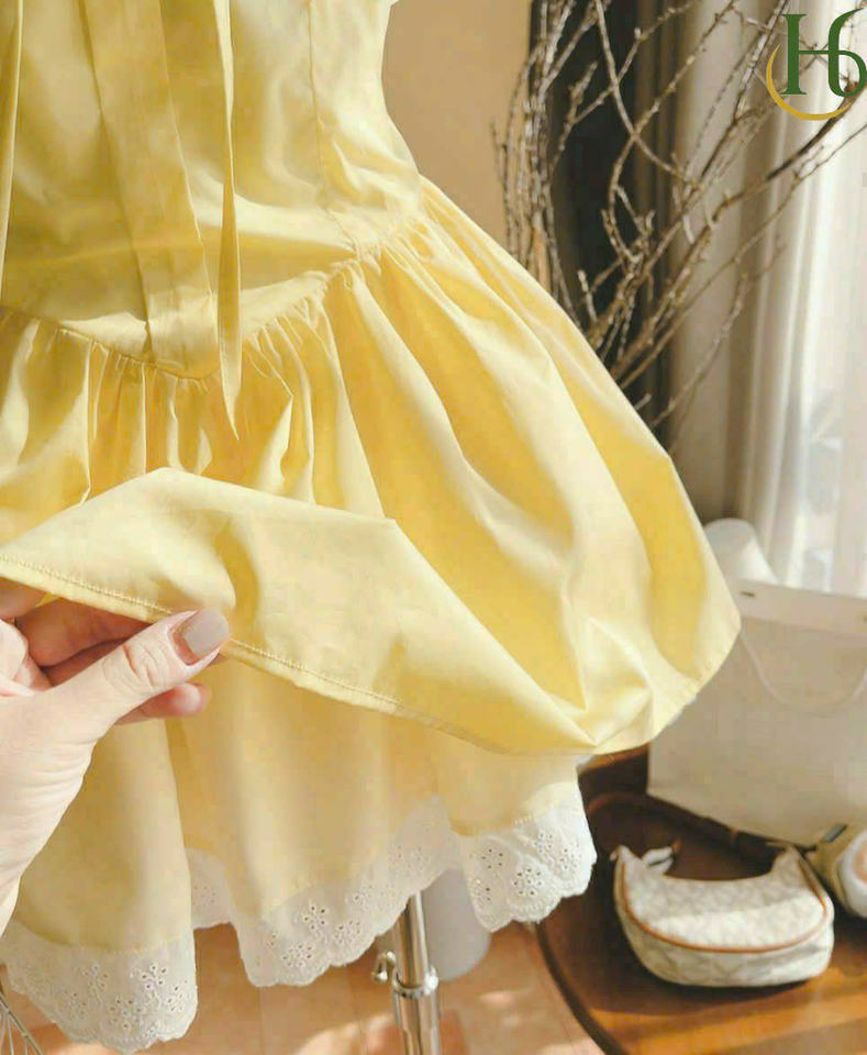 เดรสสั้นสีเหลืองแบบผูกโบว์ที่อก สายเดี่ยวแบบสปาเก็ตตี้ ดีไซน์เวียดนาม แต่งโบว์ผูกด้านหน้า ทรงสวยหวาน