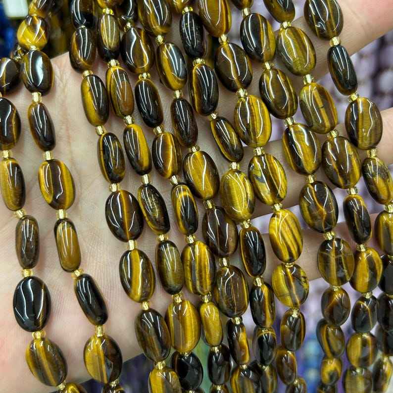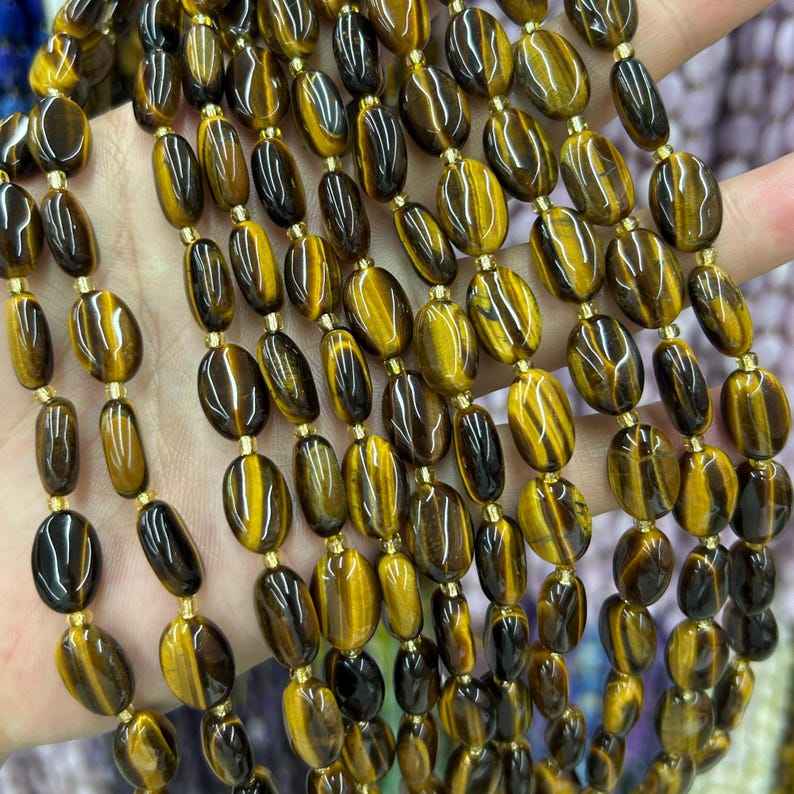ลูกปัดหินตาเสือสีเหลืองรูปไข่ หินธรรมชาติ ลูกปัดหินหลวมสำหรับทำเครื่องประดับ DIY สร้อยข้อมือ สร้อยคอ