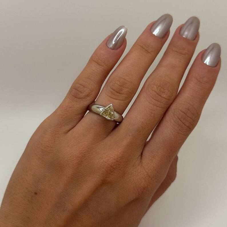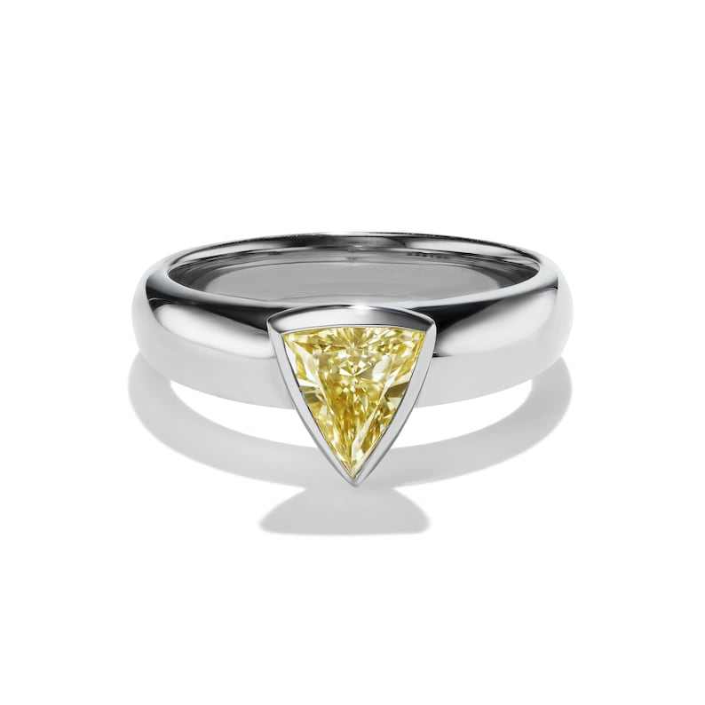 แหวนเพชรทรงสามเหลี่ยมทรงทันสมัยสีเหลืองทรงทริลเลียนคัท เพชรเพาะเลี้ยงในห้องปฏิบัติการ ดีไซน์เรียบหรู ทองคำขาว 14K ของขวัญเครื่องประดับชั้นดีสำหรับวันเกิด