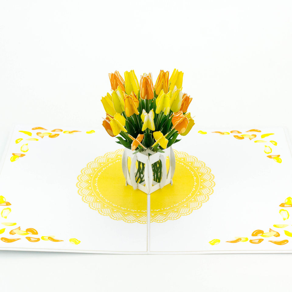 การ์ดป๊อปอัพแจกันดอกทิวลิปสีเหลืองทำด้วยมือจากงานหัตถกรรมกระดาษเวียดนามพิมพ์ออฟเซ็ตสำหรับเป็นของที่ระลึก