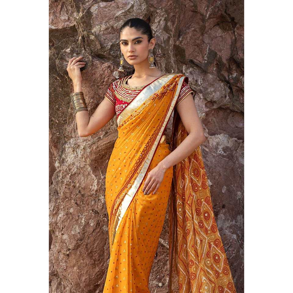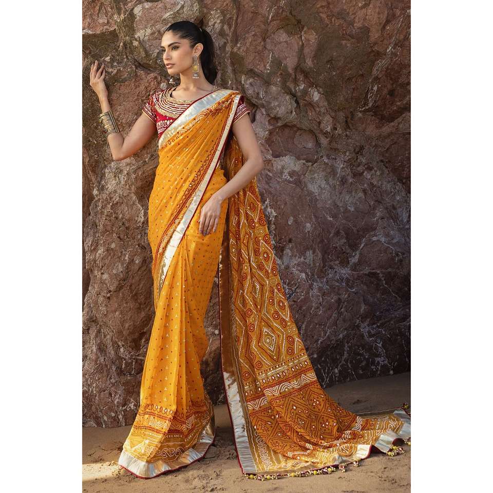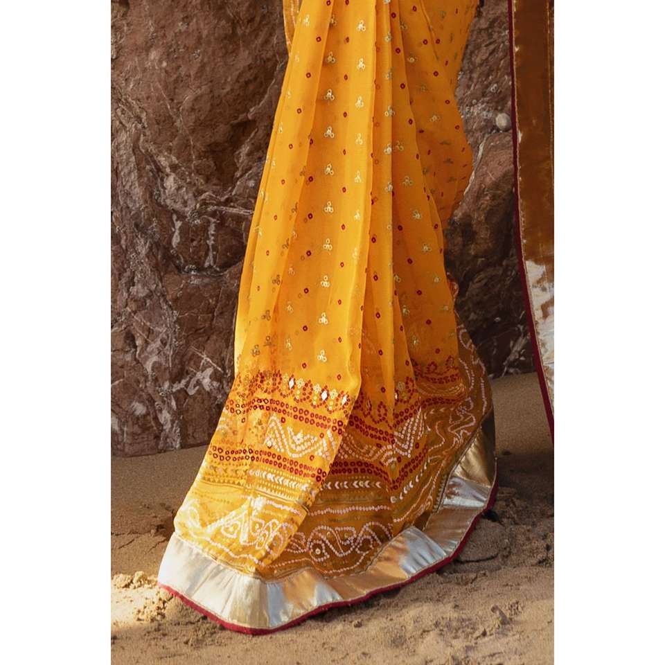 ผ้าซิฟฟอนสีเหลืองปักเลื่อมแบบกอต้า พร้อมชุดเสื้อ 3 ชิ้น