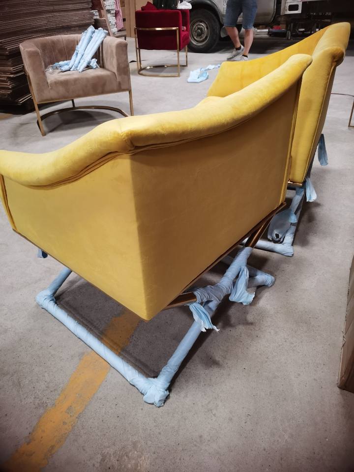 เก้าอี้เน้นผ้ากำมะหยี่สีเหลืองที่มีที่เท้าแขนด้านขวาและขาสีทอง