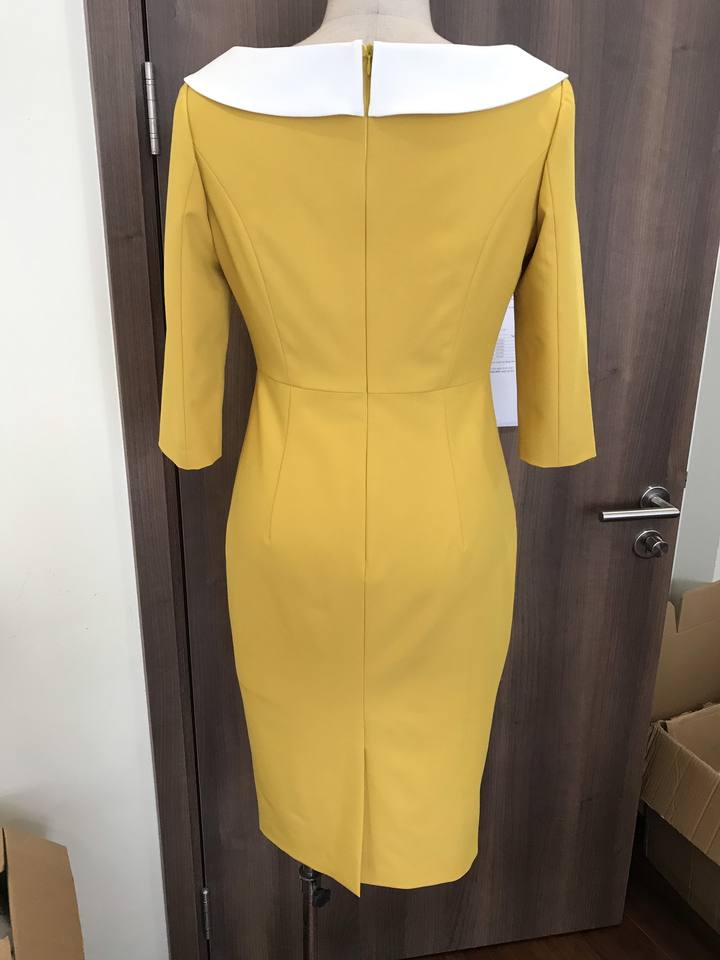 ชุดเดรสสีเหลืองขาว คอทรงโอ เอวธรรมชาติ คุณภาพสูง สำหรับใส่ทำงาน ความยาวระดับเข่า ชุดเดรสสุภาพสำหรับผู้หญิง
