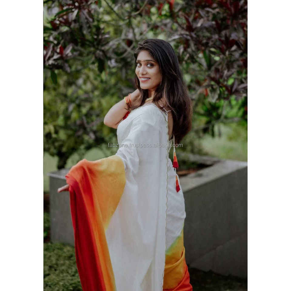 ชุด Saree ผ้าลินินพิมพ์ลายดิจิทัลสีเหลืองและสีแดงสง่างามสำหรับงานเลี้ยงตอนเย็น