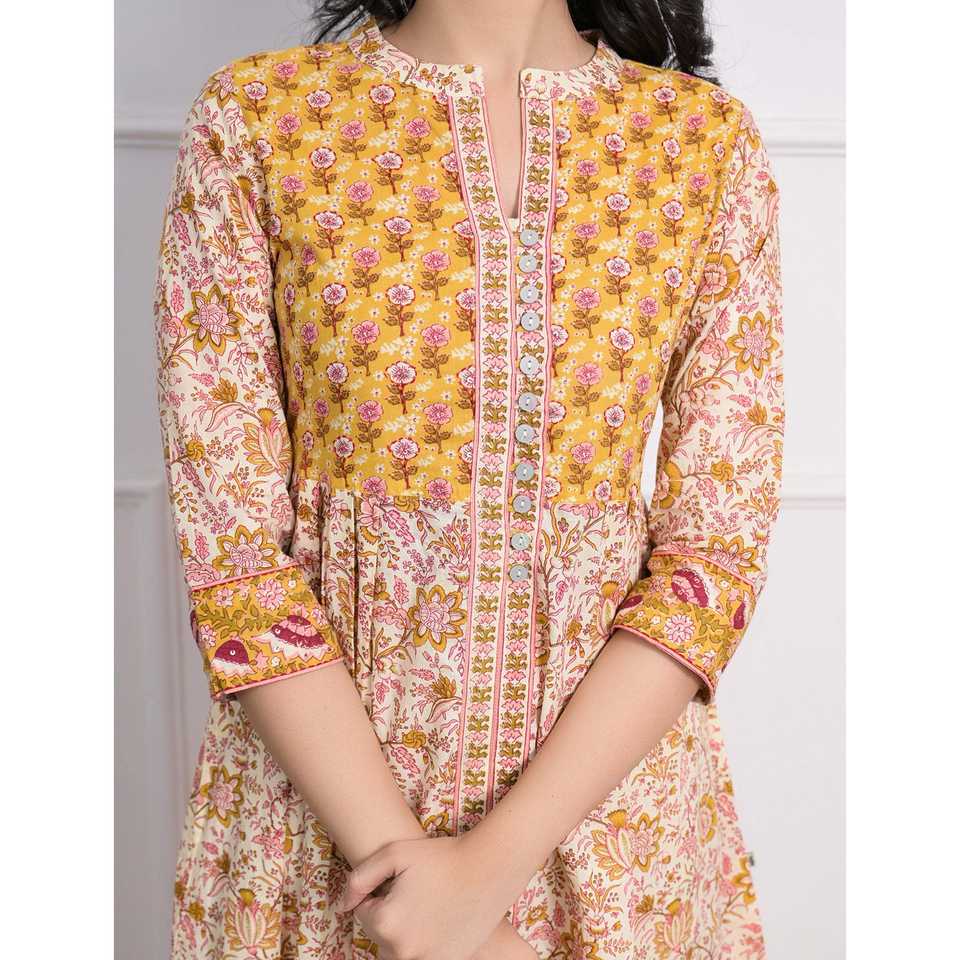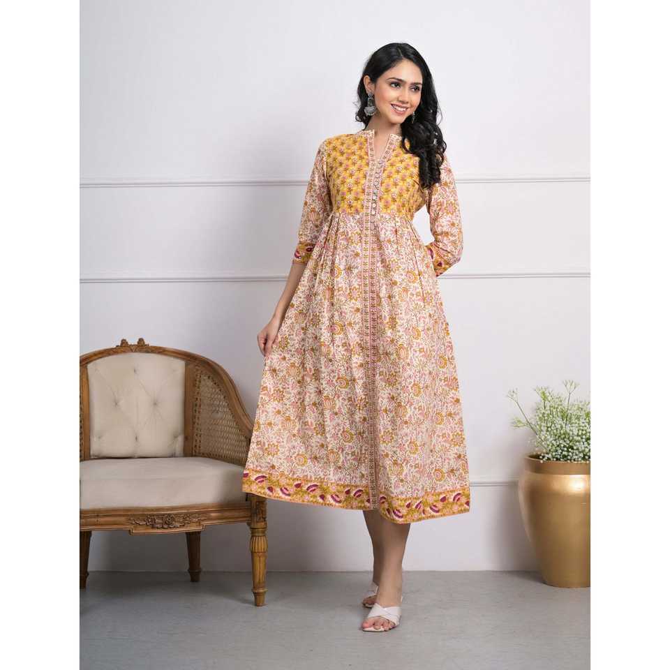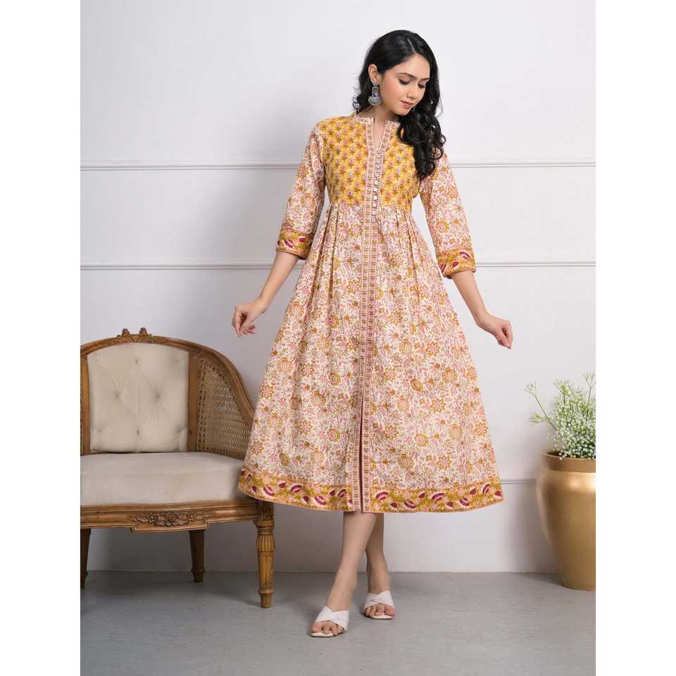 เดรสผ้าฝ้ายสีเหลืองพิมพ์ลายบล็อกทรงเอไลน์ยาว ดีไซน์หรูหรา สไตล์ลำลองสำหรับผู้หญิง สไตล์ฮิปปี้ เอวทรงเอ็มไพร์ ระบายอากาศได้ดี ยาวถึงพื้น