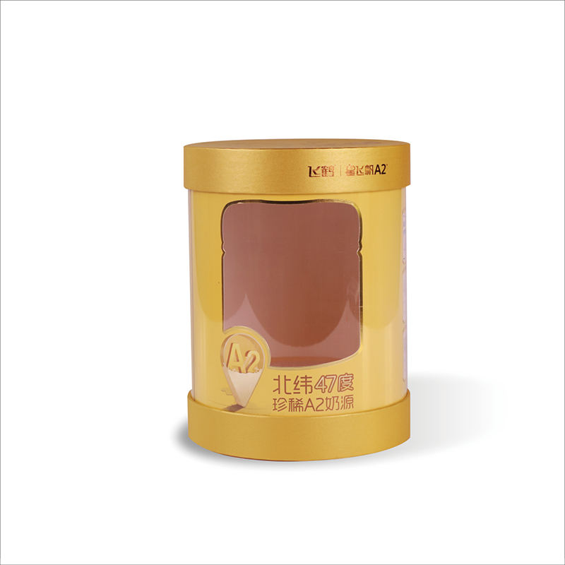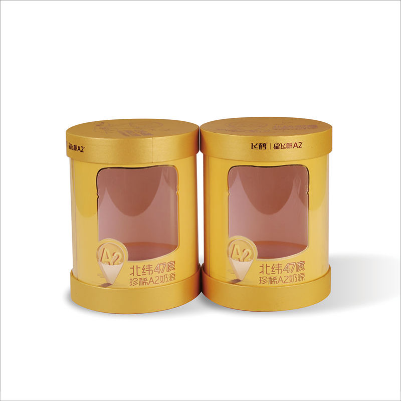 กล่องกระดาษทรงกระบอกที่กำหนดเองพิมพ์สีเหลืองพร้อมหน้าต่างใสสำหรับบรรจุภัณฑ์นมผง