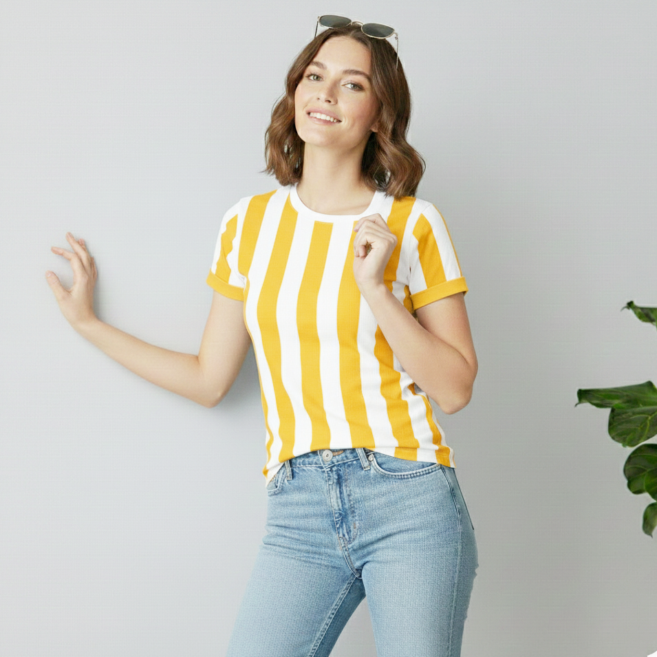 เสื้อยืดสีเหลืองขาวสำหรับผู้หญิง พร้อมบริการ OEM คุณภาพเยี่ยม เสื้อผู้หญิงแขนสั้น คอกลม