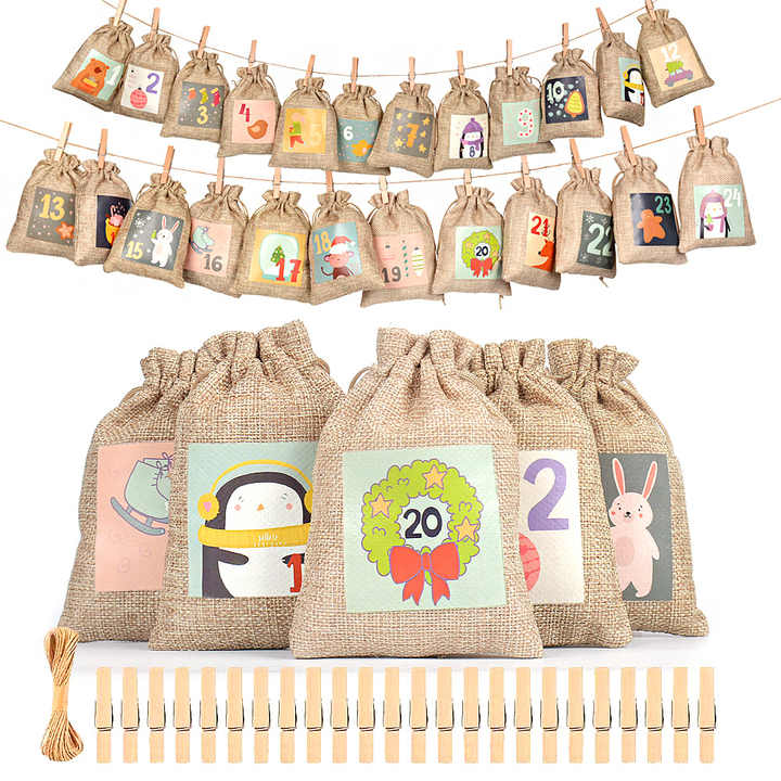 Yiwu 2025 Recyclable Customizable Jute Drawstring Hanging Bag Set Christmas Countdown Calendar Gift Packaging