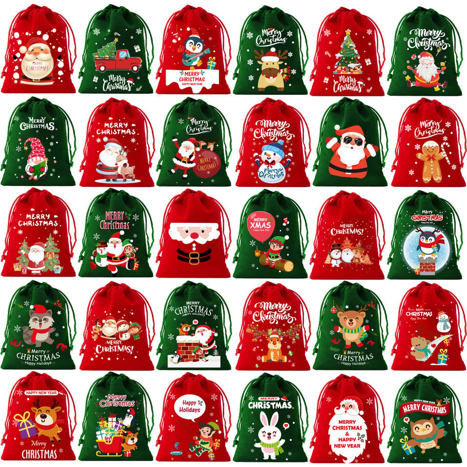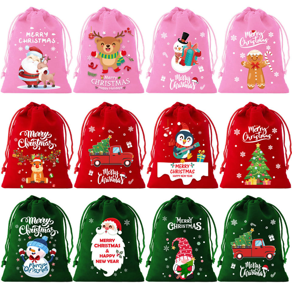 Yiwu 2025 New Christmas flocking Bag Gift Set Drawstring flocking Bag for Candy for Holiday Gifting Christmas flocking Bag