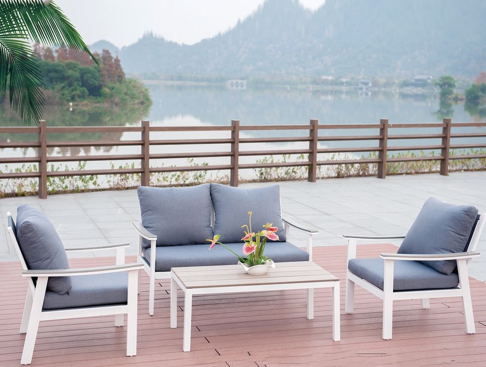 YOHO ชุดโซฟาอลูมิเนียมดีไซน์ทันสมัยเลานจ์ผ้าใหม่สำหรับใช้ในสวนกลางแจ้งเฟอร์นิเจอร์โลหะมีสไตล์สำหรับโรงแรมและสวนสาธารณะ