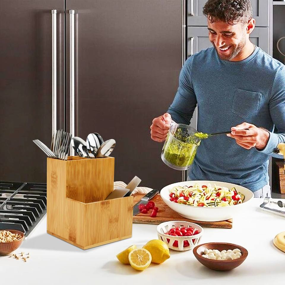 Youlike ที่วางภาชนะไม้ไผ่3ช่องอุปกรณ์ทำอาหารที่เก็บเครื่องเงิน