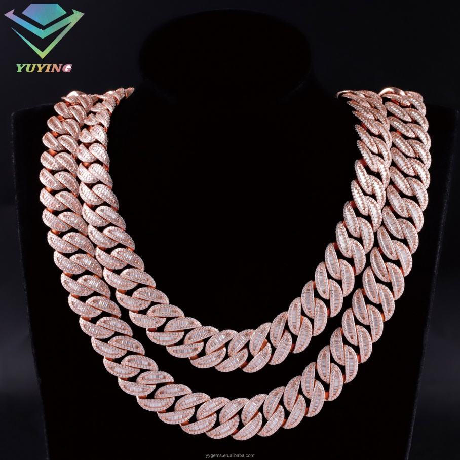 สร้อยคอเงินแท้ S925 ชุบทองคำขาวโรสโกลด์ ประดับเพชรโมอิสซาไนต์ทรงบาแก็ตต์ ขนาด 16 มม. 18 มม. แบบเต็มเส้น ยี่ห้อ Yu Ying