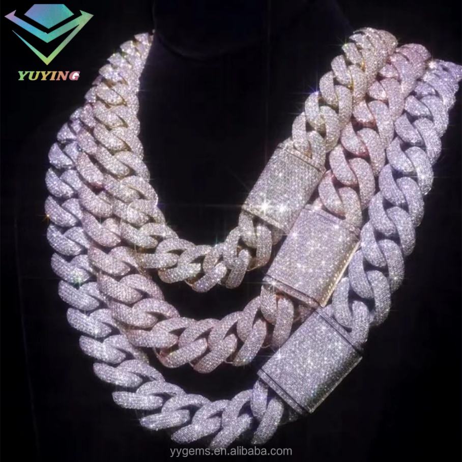 สร้อยคอแบบคิวบันลิงค์เงินแท้ S925 ชุบทองคำขาว ประดับด้วยมอยส์ซาไนต์ทรงเหลี่ยมมรกตขนาด 20 มม. เกรด VVS สำหรับผู้ชาย ยี่ห้อ Yu Ying Custom สไตล์ฮิปฮอป