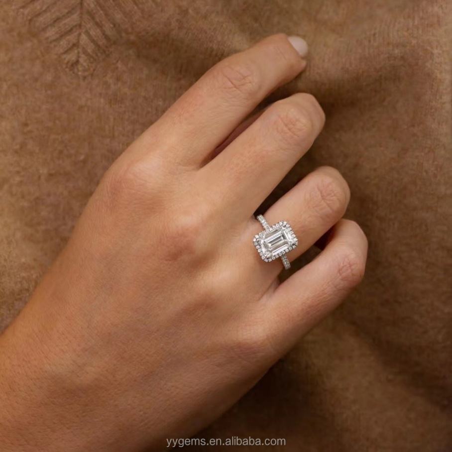 แหวนแต่งงาน/หมั้นเพชรขาวคุณภาพสูง 4 กะรัต ทรง Emerald Cut ประดับด้วย Halo ทองคำแท้ 18K สำหรับผู้หญิง