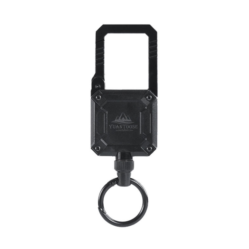 คาราไบเนอร์ยูแอนทูสแบบยืดหดได้ ผลิตจากโลหะผสมสังกะสี รับน้ำหนักได้ 2 กก. รูปทรงสี่เหลี่ยม สีดำ พร้อมโลโก้ พกพาสะดวก ใช้เป็นพวงกุญแจสำหรับกิจกรรมกลางแจ้ง