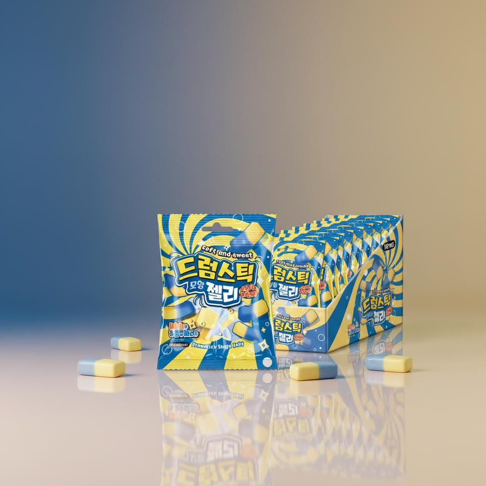 เยลลี่แท่งรูปทรงกลองหลากสี ยี่ห้อ Yum'z Bites ขนมหวานเกาหลีขายดี 50 กรัม รสผลไม้รวม บลูเบอร์รี่ กล้วย