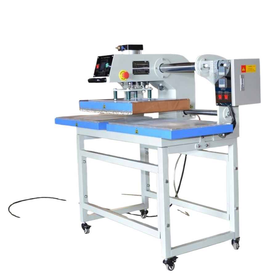 เครื่องรีดร้อนแบบกึ่งอัตโนมัติ Yunqingtech พร้อมแผ่นทำความร้อนด้านบนและแผ่นทำความร้อนด้านล่างแบบลม ถาดคู่ สำหรับงานพิมพ์ลายลงบนวัสดุ
