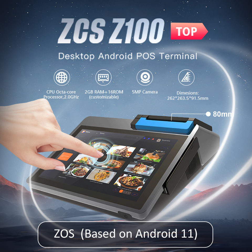 ระบบ POS แบบตั้งโต๊ะสำหรับแท็บเล็ต Android Z100 พร้อมจอแสดงผลคู่ขนาด 10.1 นิ้ว หน้าจอสัมผัส เครื่องพิมพ์ 80 มม. และเครื่องสแกนบาร์โค้ด