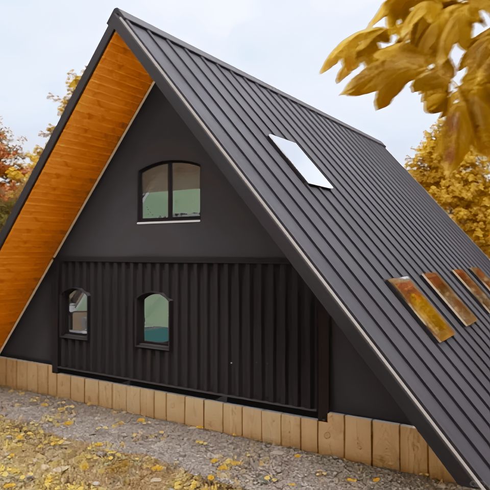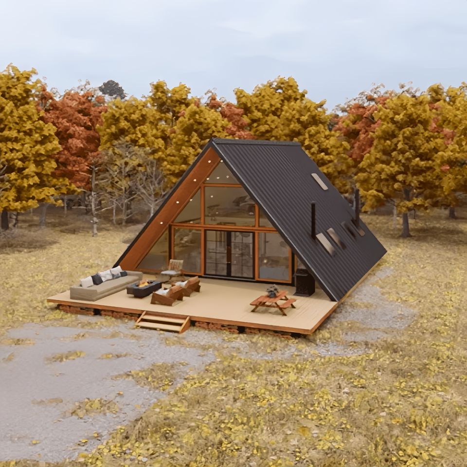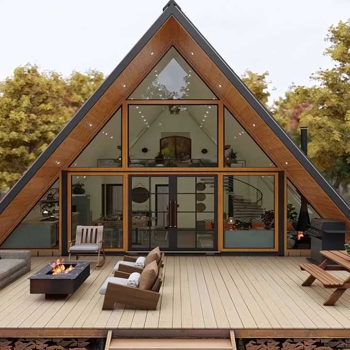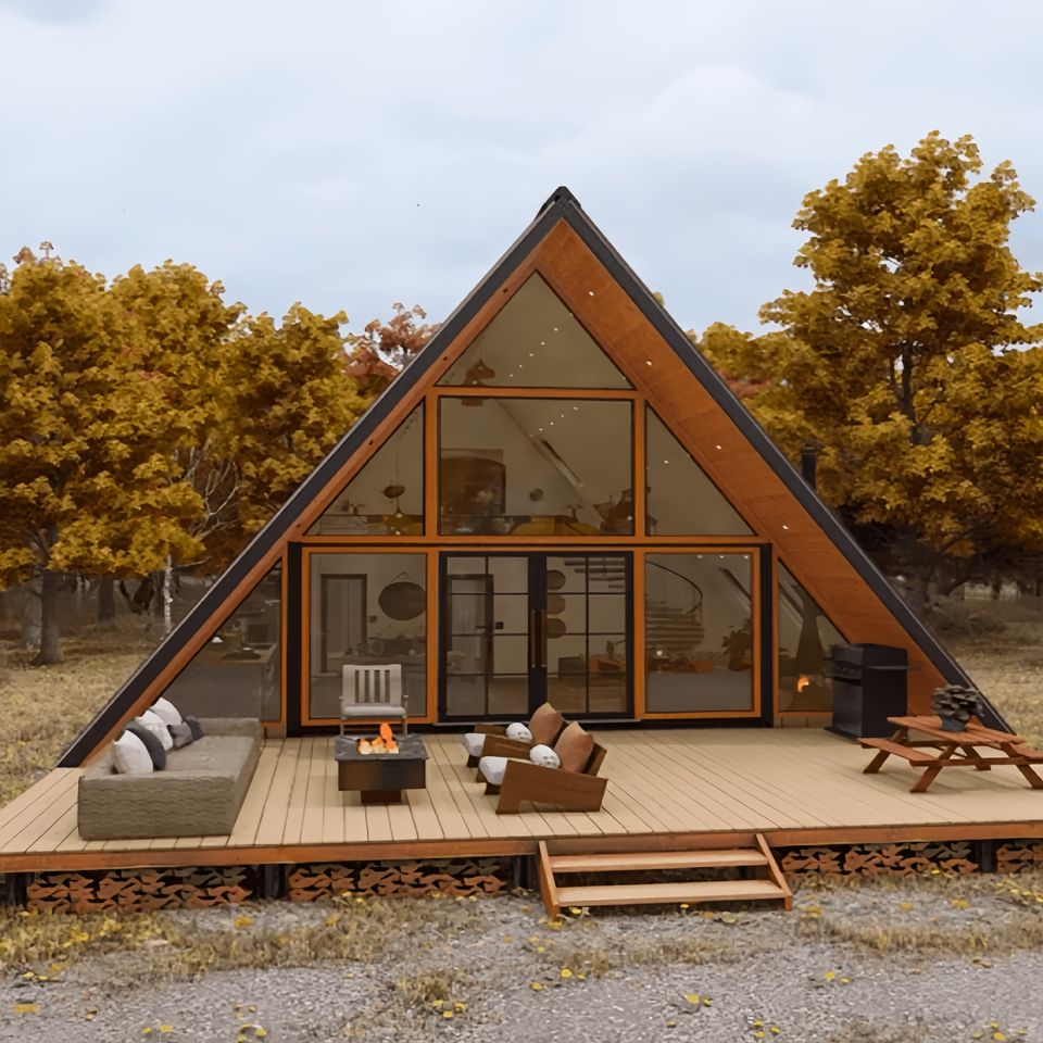 บ้านพักตากอากาศหรูหราสำเร็จรูปทรงสามเหลี่ยมแบบโมดูลาร์ โครงสร้างกระจก/ไม้ โครงเหล็ก