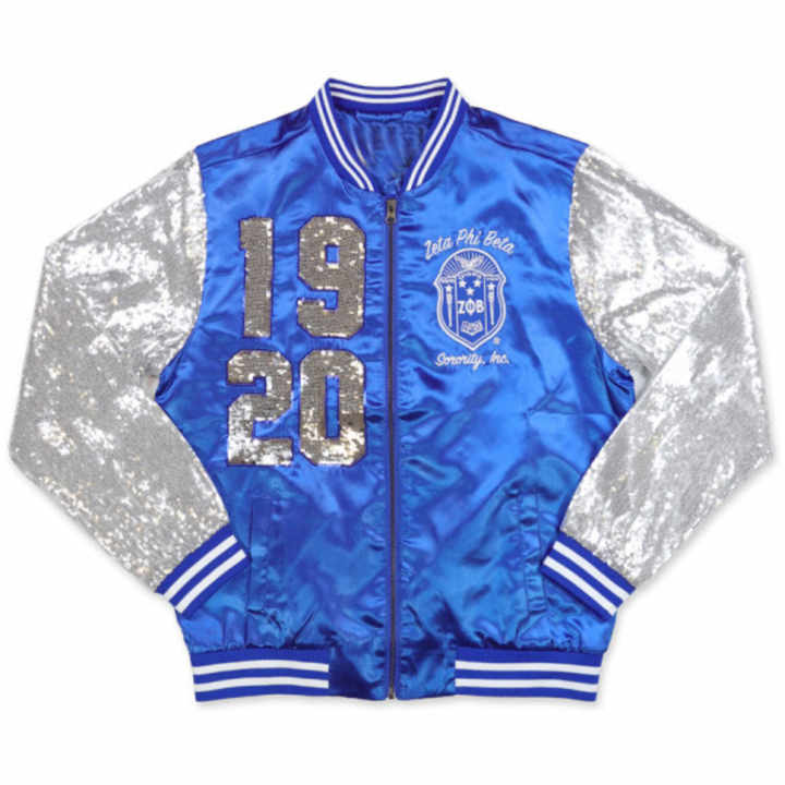 Zpb แจ็คเก็ตเลื่อม100% สีฟ้าแจ็คเก็ตโพลีเอสเตอร์ Zeta phi Beta ปักโลโก้ทีมบนเครื่องแต่งกายกรีกที่ทันสมัย