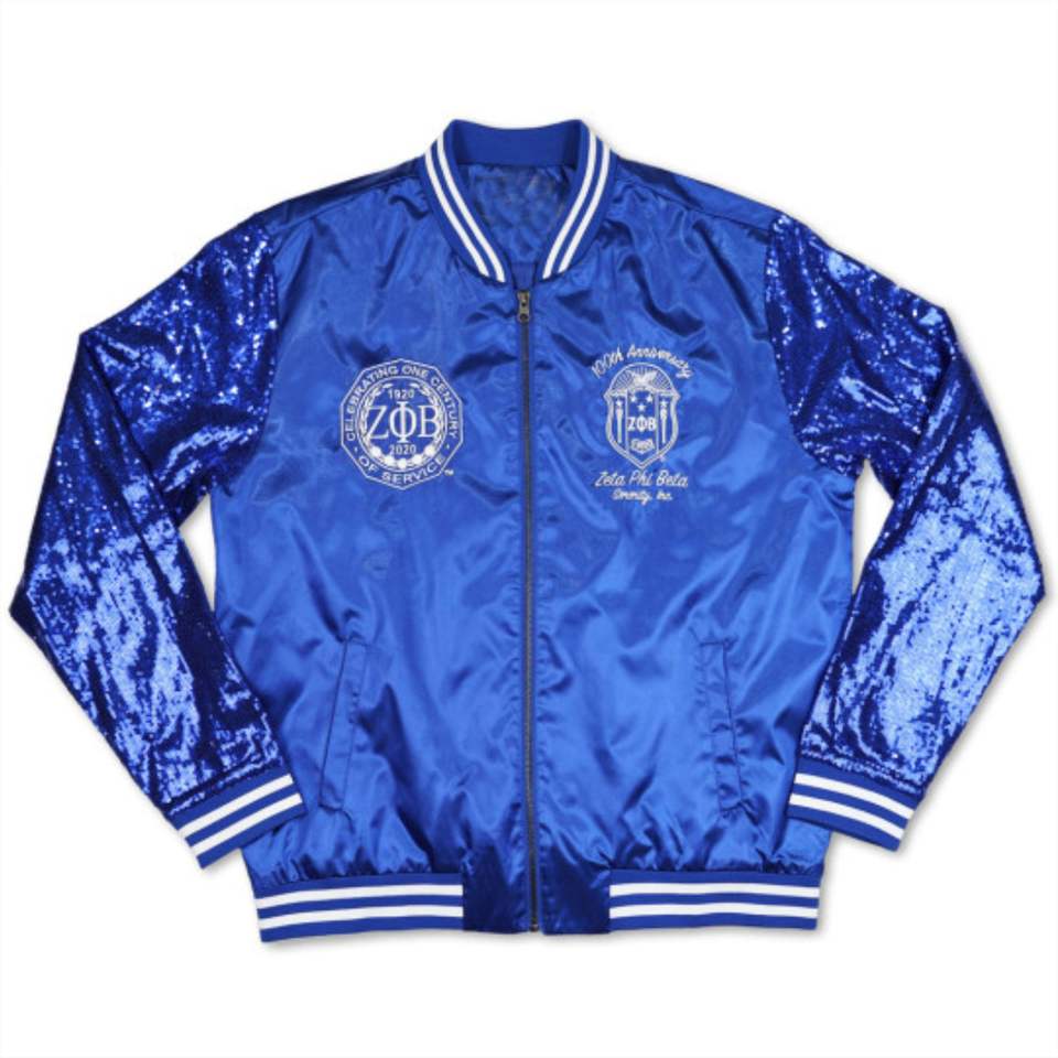เสื้อแจ็กเก็ตปักเลื่อม zpb-สีฟ้ารอยัล | แจ็คเก็ต100% ีเอสเตอร์ Zeta phi Beta พร้อมโลโก้ทีมปักที่ด้านหน้า | เครื่องแต่งกายกรีกทันสมัย