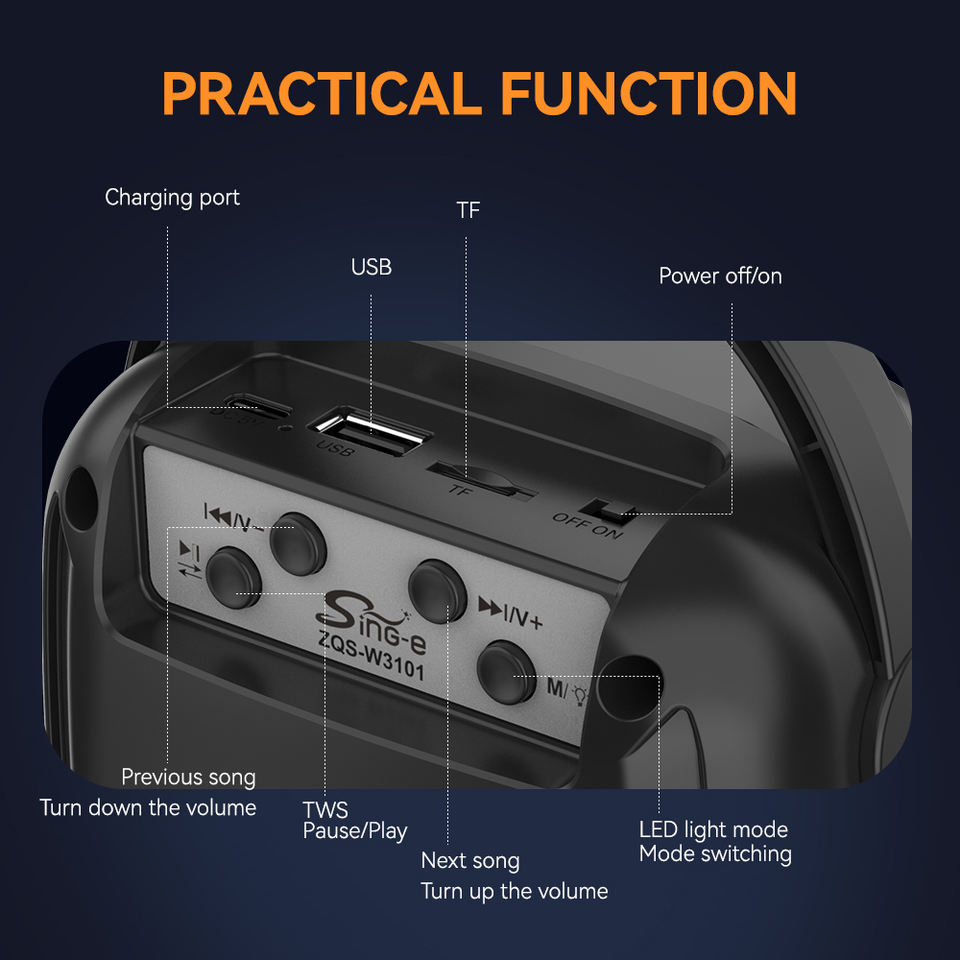 ลำโพงคาราโอเกะพกพา ZQS-W3101 เชื่อมต่อบลูทูธ พร้อมไฟ RGB LED สำหรับงานเวที กิจกรรมกลางแจ้ง งานปาร์ตี้ ไมโครโฟน 1 ตัว