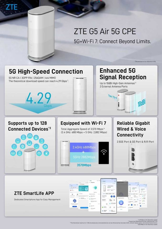 ZTE G5 Air 5G CPE WiFi 7 MC8510D Dual-Band 3570 Mbps 2.5GE Port 4.29 Gbps 5G OpenWrt ESIM/4FF Indoor Router Support 128 Users