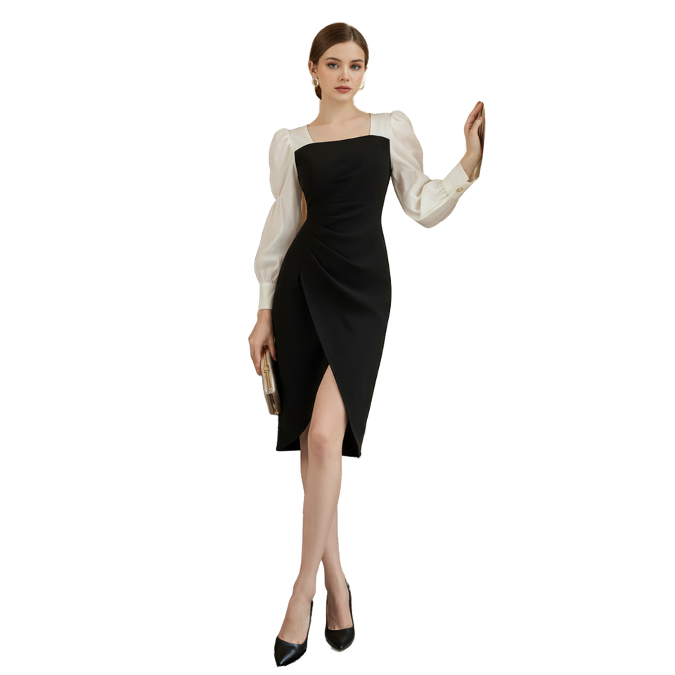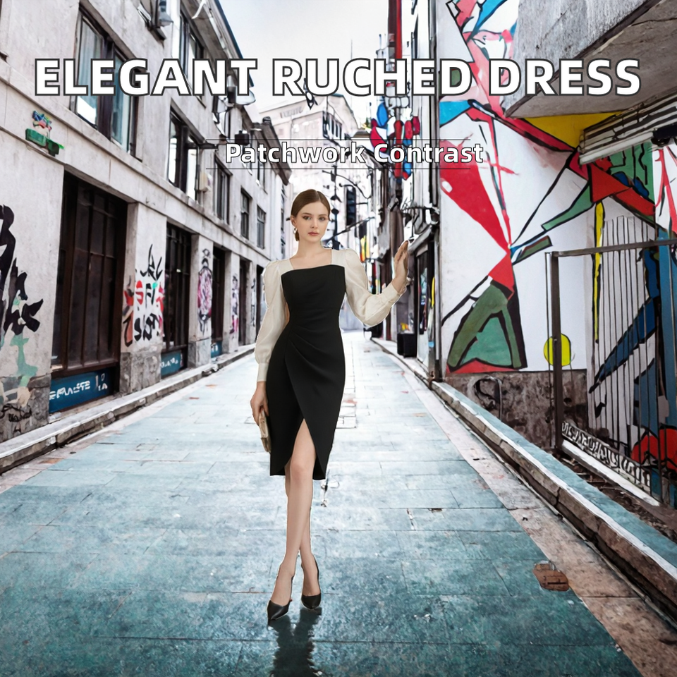 ชุดเดรสสปริงสำหรับผู้หญิง ZYHT 4478 รุ่นใหม่ล่าสุด ดีไซน์เย็บต่อผ้าแบบไม่สมมาตร แขนยาวจับจีบ แต่งระบาย ชุดเดรสยาวปานกลางทรงสวยสง่า เอวเข้ารูป