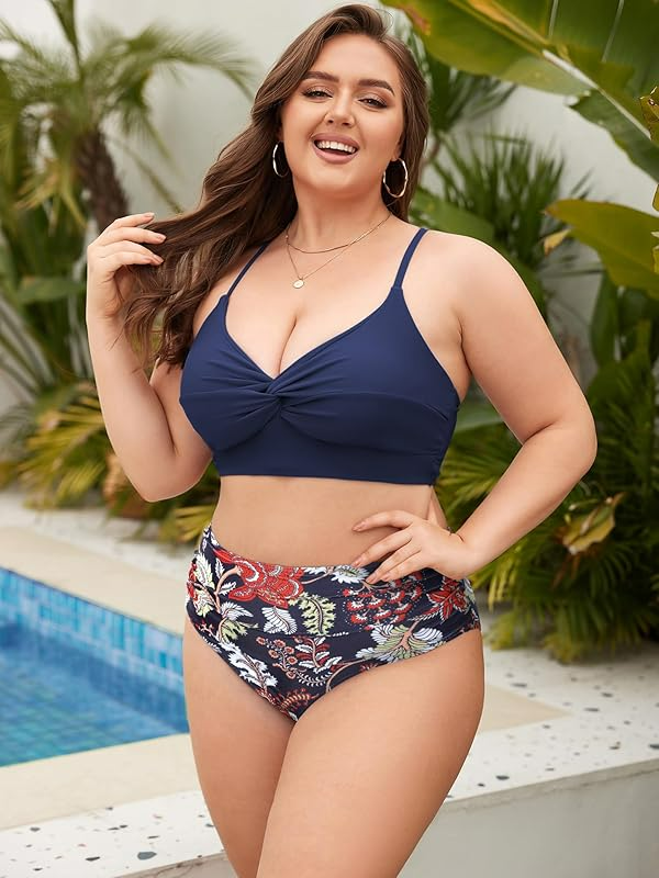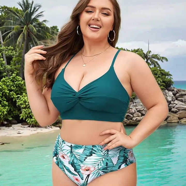 ชุดบิกินี่พิมพ์ลาย 2 ชิ้นเอวสูงแบบบิดเกลียวสำหรับผู้หญิงไซส์พลัส พร้อมบราดันทรง เป็นมิตรกับสิ่งแวดล้อมและต้านเชื้อแบคทีเรีย