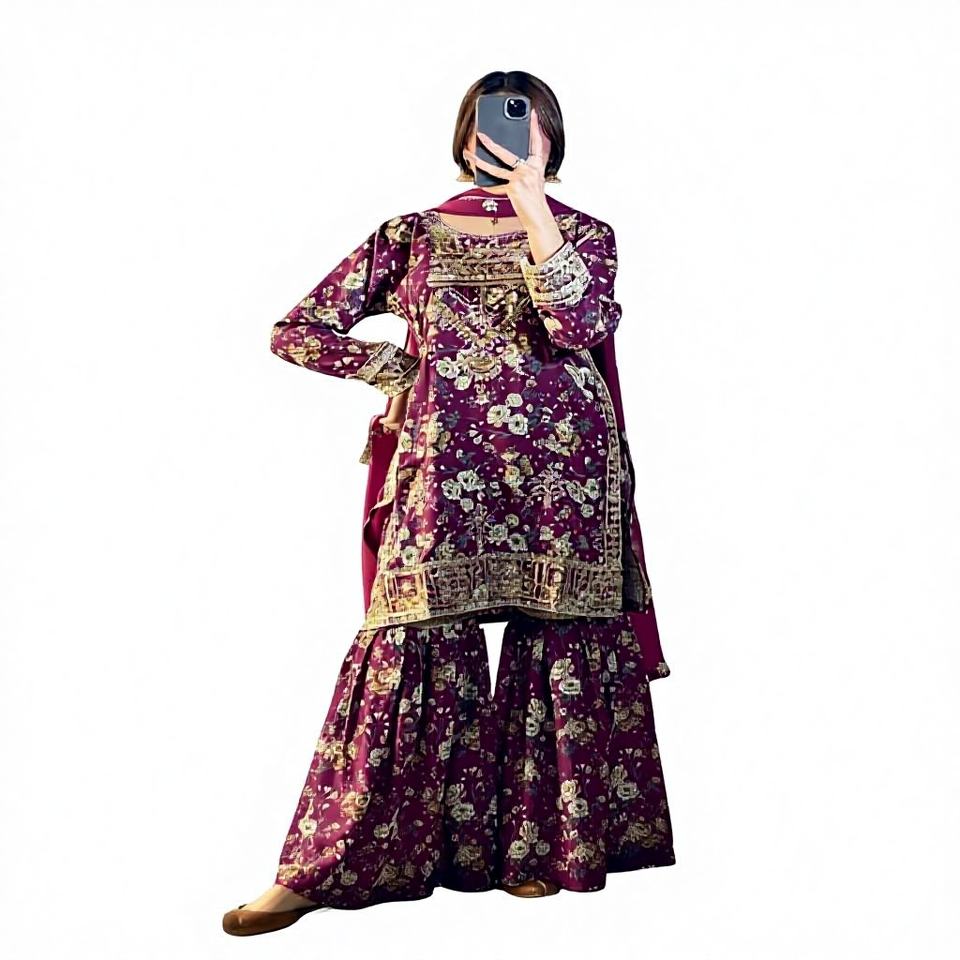 ซัยน์ เอ็กซ์พอร์ต คอลเลคชั่นใหม่ ชุดสำเร็จรูปสำหรับงานปาร์ตี้/งานแต่งงาน ชุดสามชิ้น ลายพิมพ์ รีเวอร์เซอร์ โมเดิร์น คุर्ติ ชารารา ดูปัตตา ผ้าแท้